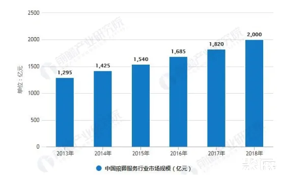 结合目前中国城市和农村的墓地购买(租赁)消费情况和殡仪服务消费支出的差异,前瞻测算,2018年我国平均殡葬费用(包含墓地)每具遗体约为20000元,按照死亡人数993万人计算,2018年中国殡葬行业市场规模约为2000亿元。