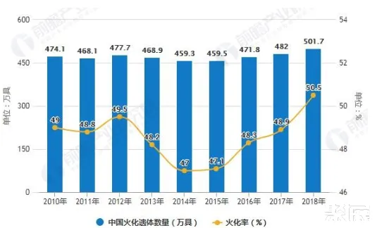 据民政部发布的《2018年民政事业发展统计公报》数据,受政策执行情况的影响,近年来我国火化遗体数波动增长,火化率先下降后上升。截至2018年底,全国共有火化炉6444台,火化遗体501.7万具,火化率50.5%,比上年增加1.6 个百分点。