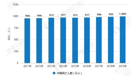 根据国家统计局发布的数据,2011-2018年,虽然我国死亡率有所波动,但是从死亡人数来看,除2015年略有下降以外,我国死亡人数保持着不断上升的态势,2018年已经达到993万人,随着我国老龄化人口的增多,未来我国每年死亡人口数量还会保持小幅增长,前瞻测算2019年我国死亡人数将会达到1000万人。