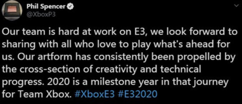 菲尔·斯宾塞在推文中表示Xbox的团队正在为E3努力准备着,他们期待着与所有喜欢Xbox的玩家分享未来将与大家见面的新内容。Xbox团队的艺术形式一直由创造力和技术所推动。2020年对于微软Xbox团队来说将会是具有里程碑意义的一年。并且在斯宾塞回复粉丝的内容中表示今年的E3将会有与粉丝互动的特别部分,因为玩家一直都是E3最特别的一部分。