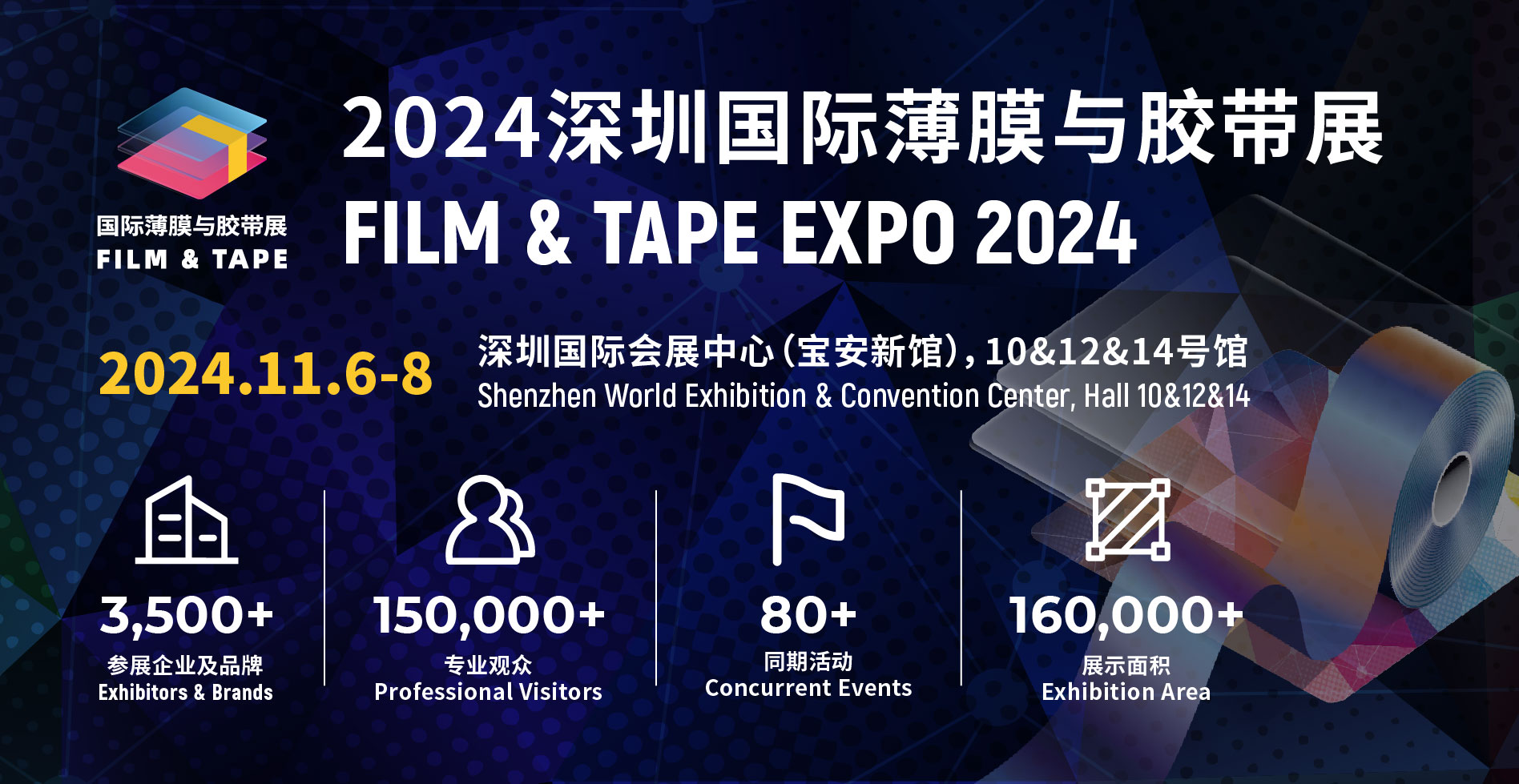 2024年11月6-8日,深圳国际薄膜与胶带展将联合五大同期展会在深圳国际会展中心(宝安新馆)10&12&14号馆盛大举行。本届展会以“膜材创新,胶连万物”为主题,预计展出面积160000㎡,汇聚超3500全球功能性薄膜和胶粘制品上下游产业厂家。举办主题论坛80+,吸引来自触控显示、数码电子、塑料包装、印刷标签、模切厂、3C家电、汽车、锂电池、光伏、 PCB/FPC线路板、半导体、建筑装饰等超15万国内外采购商莅临,呈现一场功能性材料产业链的饕餮盛宴。