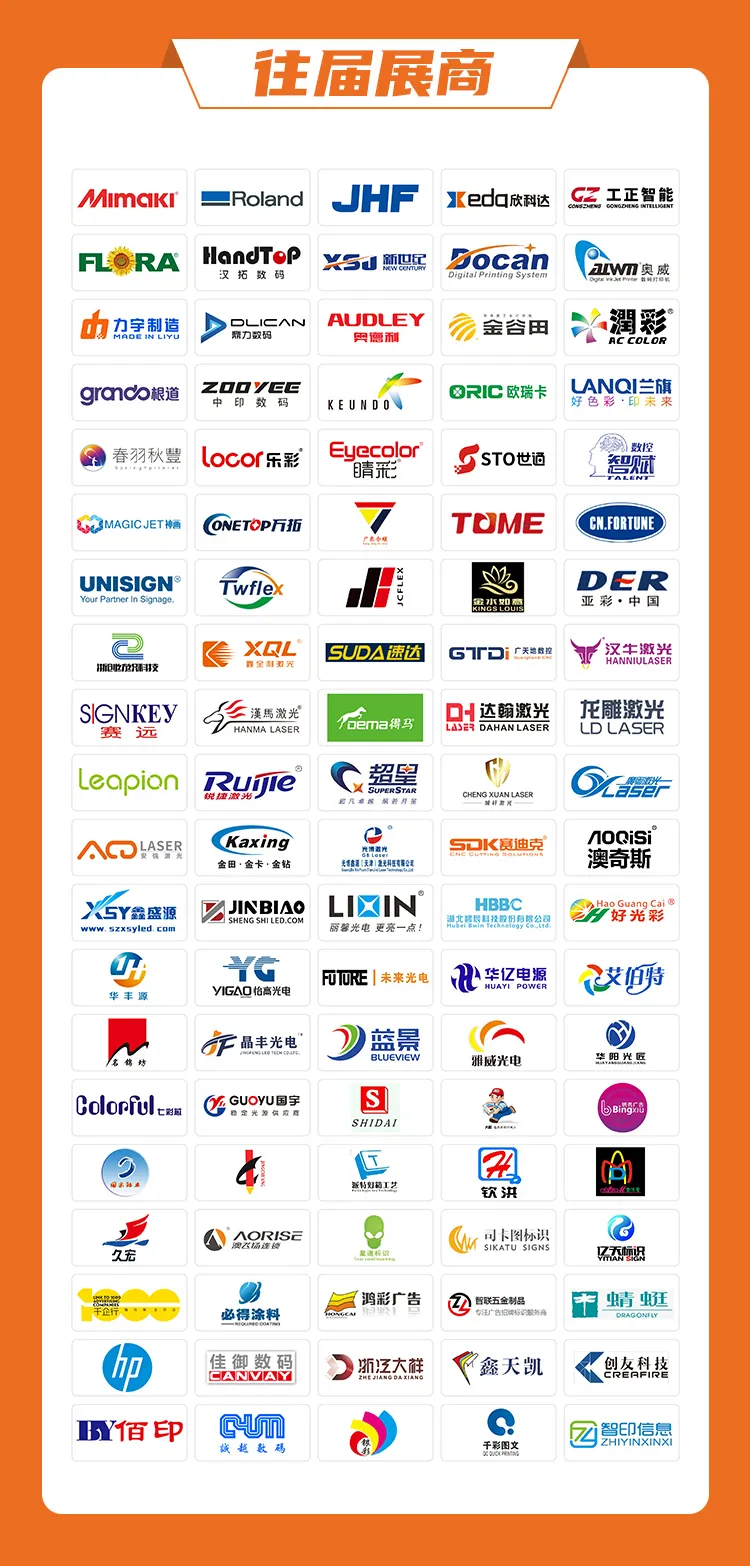 这些企业代表了广告标识行业的多个方面,包括数字喷印设备、数控雕刻设备、数字喷印材料、激光雕刻设备、墨水、亚克力等材料、标牌、牌业、灯箱、展示器材、LED屏显及发光源等。这些企业在各自的领域内具有较高的知名度和影响力。