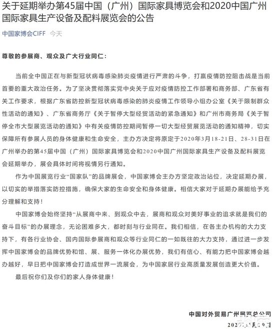 原定于2020年3月18-21日、28-31日在广州举办的第45届中国(广州)国际家具博览会和2020中国广州国际家具生产设备及配料展览会延期举办,展会具体时间将视情况另行通知。