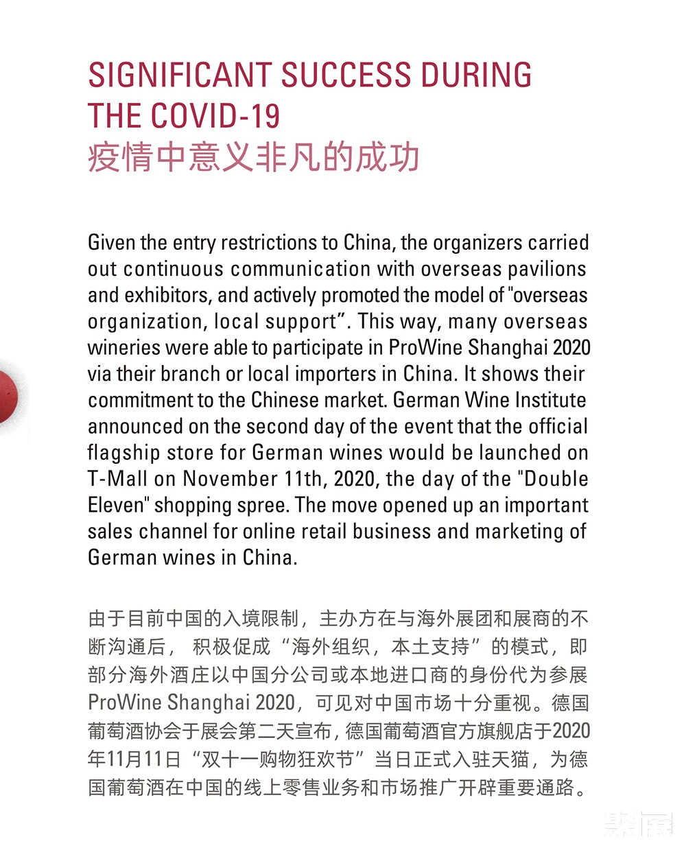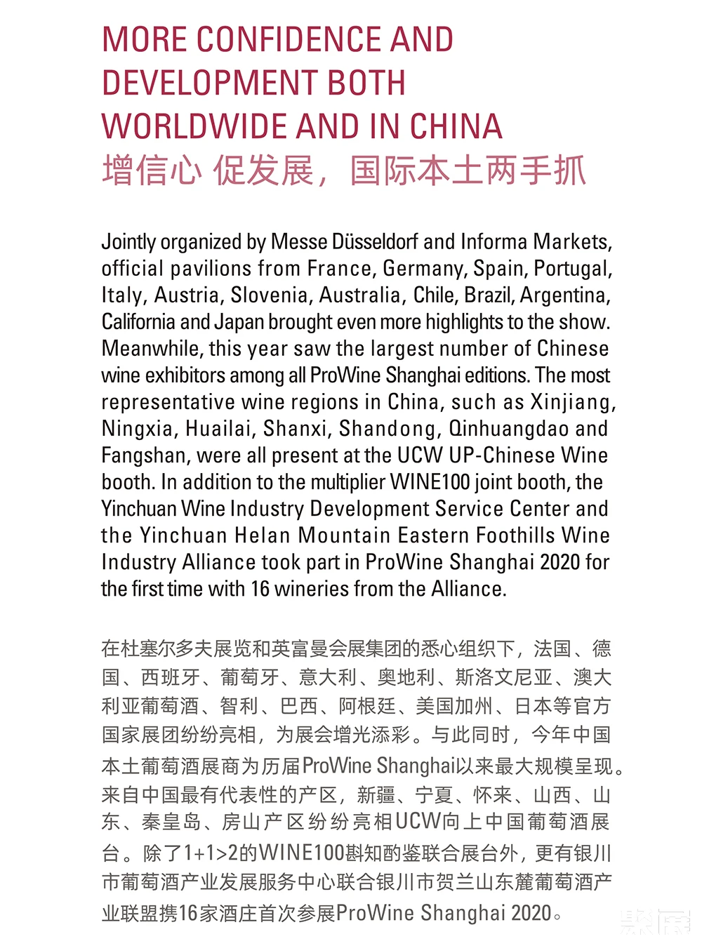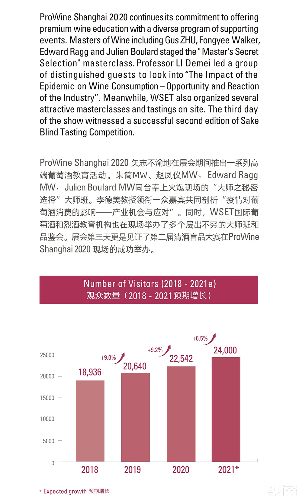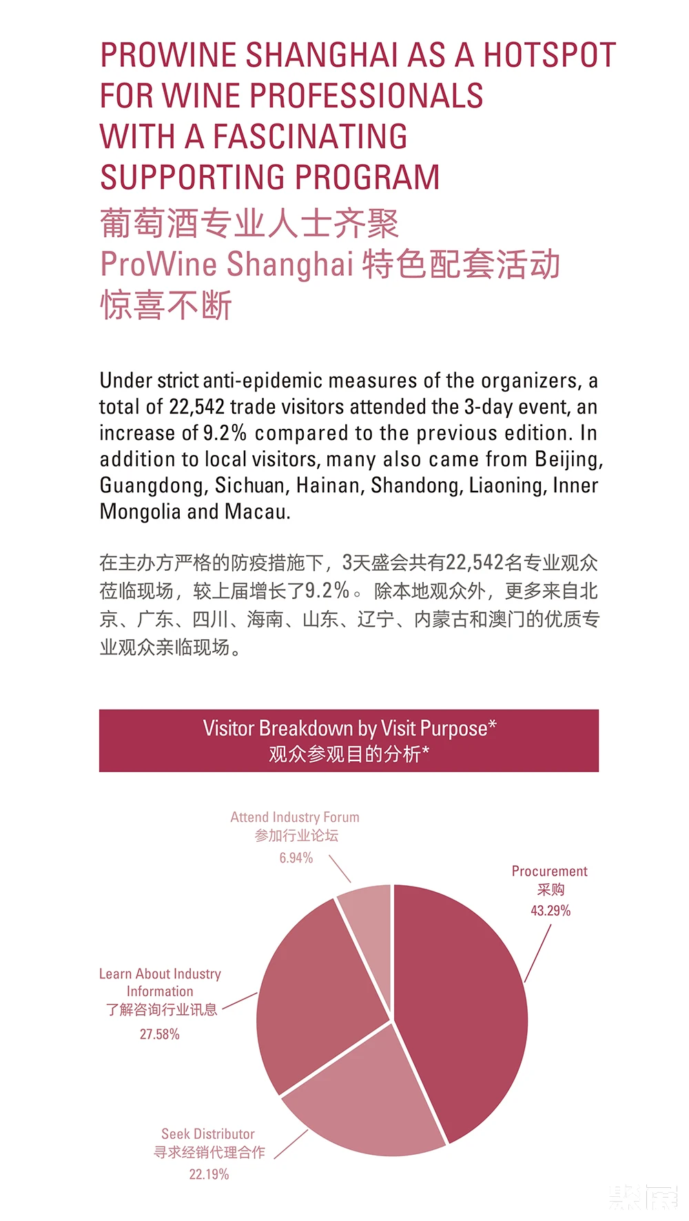展会介绍:上海国际葡萄酒、红酒及烈酒贸易展览会(ProWine Shanghai)是中国领先的葡萄酒与烈酒贸易展览会。每届展会收到了与会人士的积极反馈,并将新标准定为中国大陆最具国际性的葡萄酒和烈酒交易会。唯葡萄酒中国的游客和国际参展商人数继续增长,今年继续创造新的纪录。ProWill中国公司在各大城市的持续推广和宣传活动使ProWine Shanghai平台的存在和成就不断增加。
