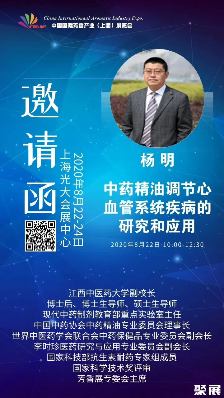 本届芳香展同期举办"芳香产业发展高峰论坛",邀请了江西中医药大学杨明副校长为大家带来<中药精油调节心血管系统疾病的研究和应用>主题分享,为大家在中药精油开发和芳香精油在健康养护领域的应用提供新思路。敬请期待!