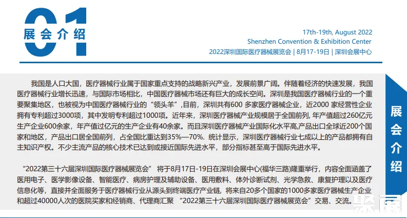 “2022深圳国际医疗器械展览会” 将于8月17日-19日在深圳会展中心(福华三路)隆重举行。内容全面涵盖了包括医用电子、医学影像设备、智能医疗、病房护理及辅助设备、医用敷料、体外诊断试剂、光学急救、康复护理以及医疗信息化等。直接并全面服务于医疗器械行业从源头到终端医疗产业链,将来自20多个国家的1000余家医疗器械生产企业和超过40000人次的医院买家和经销商、代理商汇聚 “2022深圳国际医疗器械展览会”交易、交流。