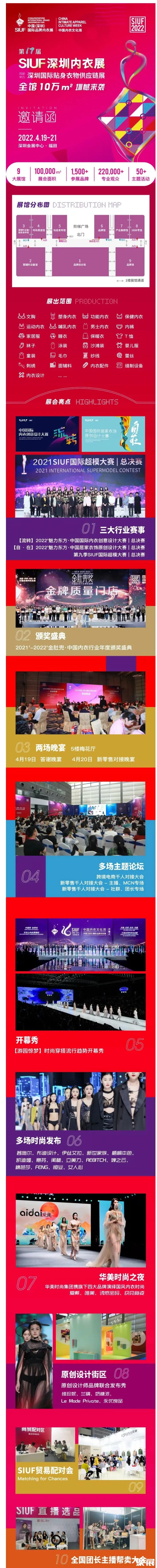 SIUF 怀揣“共建·共享·共生·共赢,打造全球内衣生态圈”的愿景,多年的精心培育,深圳内衣展已成为全球最具规模和影响力的行业价值服务平台。服务于内衣贴身时尚品牌、生产制造商、供应商、渠道商、新零售电商、爆品直播、跨界时尚等众多渠道,打造为内衣产业链条完整且丰富的综合性展会。同期将举办金肚兜奖颁奖盛典、中国内衣峰会、魅力东方内衣创意 / 居家衣饰原创设计大赛、SIUF 国际超模大赛三大赛事总决赛,及多品牌新品发布秀等, 引领全球内衣时尚潮流新趋势。