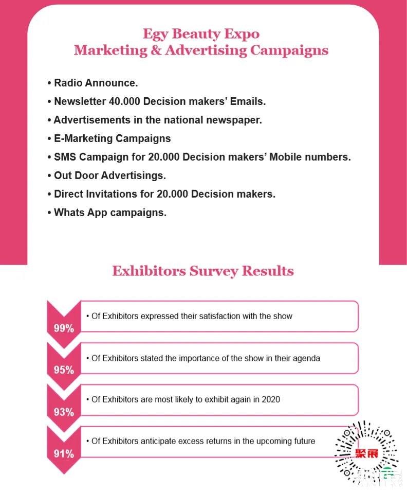埃及美容及化妆品展-非洲美容展2025在线预定展位 聚展为您呈现展位图、展位价格、参展商名录、会刊申请、邀请函申请、门票购买、签证服务、展位搭建等。想了解更详细资料,请联系聚展~ 本资讯由聚展网工作人员整理编辑,我们是一家汇集全球展会时间地点、门票购买、展位申请、展商名录及展会会刊的服务平台。参考资料: