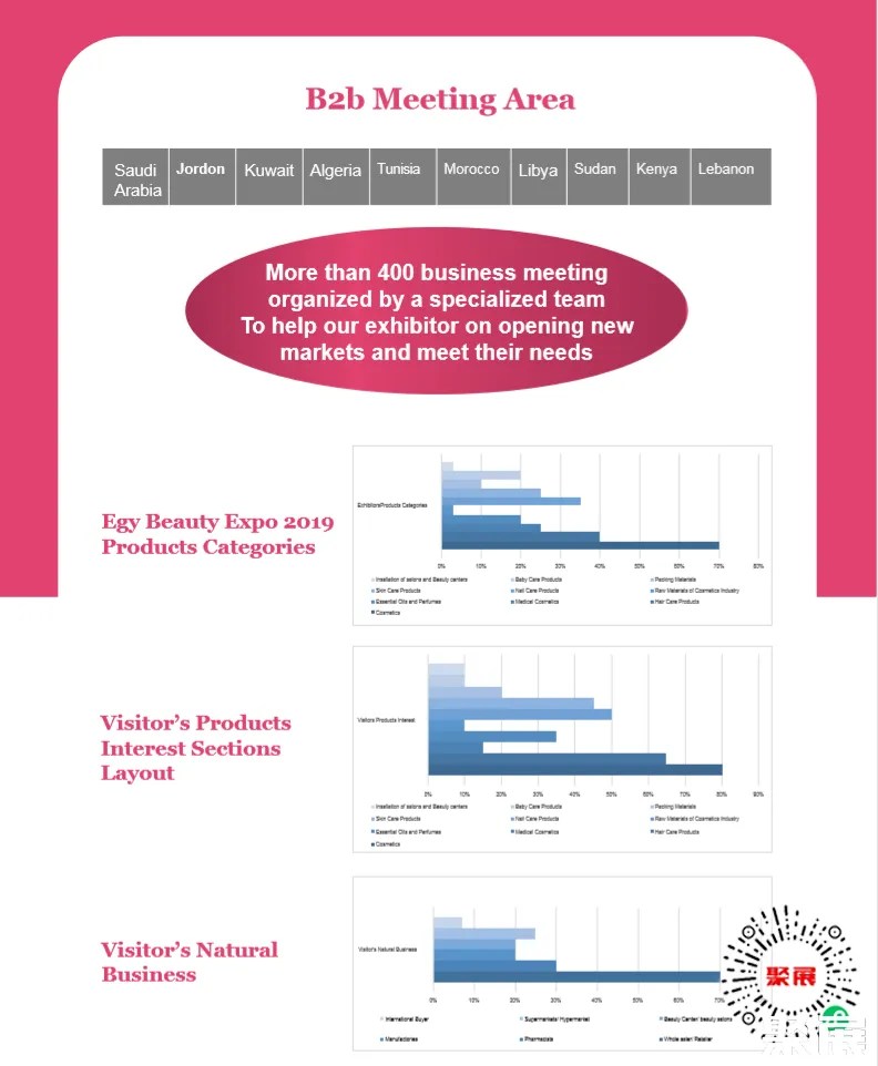 作为一个专业的B2B展会,采购商来自北非、全球的买家。埃及美容及化妆品展-非洲美容展(Egy Beauty Africa)作为汇集西非和北非市场美容专业人士和决策者的第一个聚会场所,会议活动包括由所有美容和美容专业人士组织的研讨会,以及参展商带来的新产品和新技术。