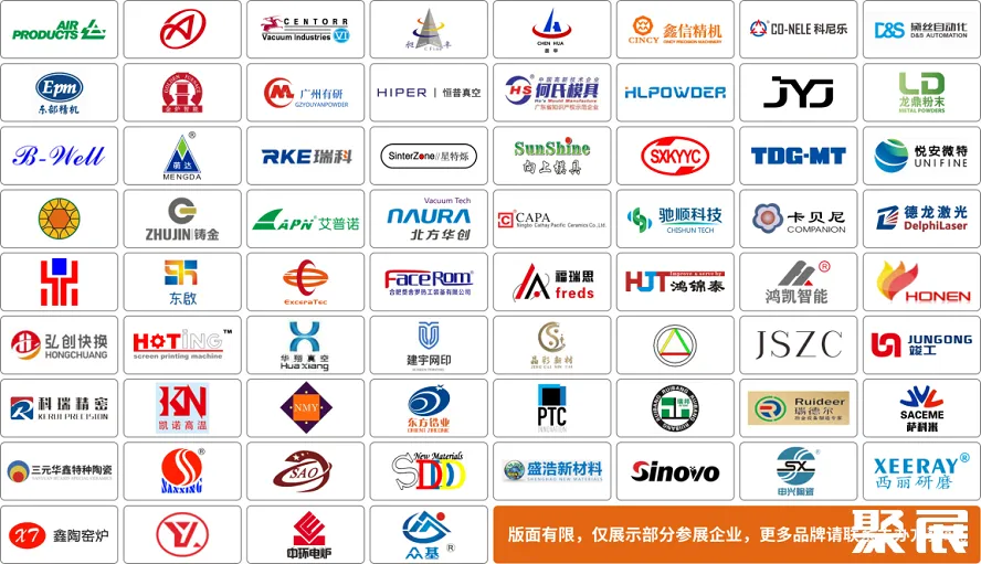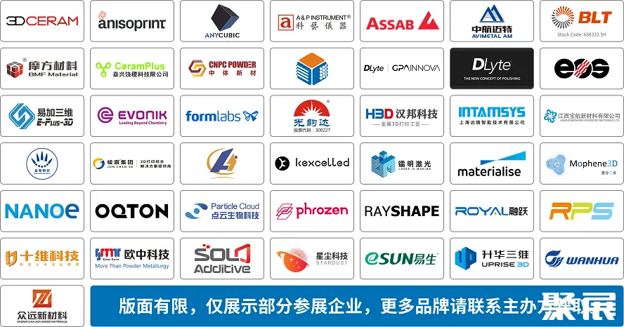 3DCeram、Anisoprint、纵维立方、科铭仪器、ASSAB、中航迈特、铂力特、摩方精密、饶稷、中体新材、德亿纬、德莱特、EOS、易加三维、Evonik、Formlabs、光韵达、汉邦科技、远铸智能、江西宝航、金物新材、峻宸智造、Kexcelled、兰理工合金、镭明科技、Materialise、墨分三维、Nanoe、Oqton、点云生物、Phrozen、铼赛、融跃电子、RPS、十维科技、欧中科技、双恩、星尘科技、中科三维、升华三维、万华化学、宁波众远等。(按企业logo英文名首字母排序)
