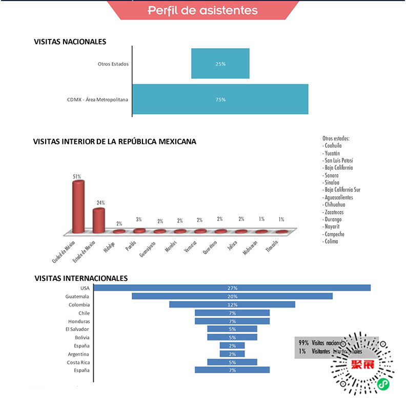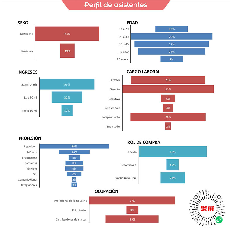 墨西哥舞台灯光及音响展览会Sound Check Expo上届展会总面积13000平方米,参展企业260家均来自中国、巴西、西班牙、英国、奥地利、日本、韩国等,参展人数达18876人。