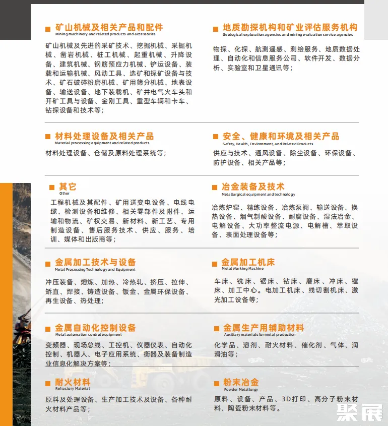 矿山机械及相关产品和配件:矿山机械及先进的采矿技术、挖掘机械、采掘机械、凿岩机械、桩工机械、起重机械、升降设备、建筑机械、钢筋预应力机械、铲运设备、装载和运输机械、风动工具、选矿和探矿设备与技术、矿石破碎粉磨机械、矿用筛分机械、地表设备、输送设备、地下装载机、矿井电气火车头和开矿工具与设备、金刚工具、重型车辆和卡车、钻探设备和技术等