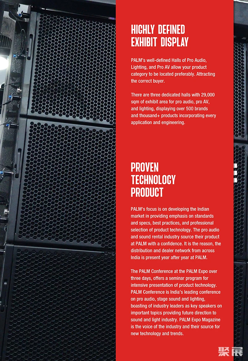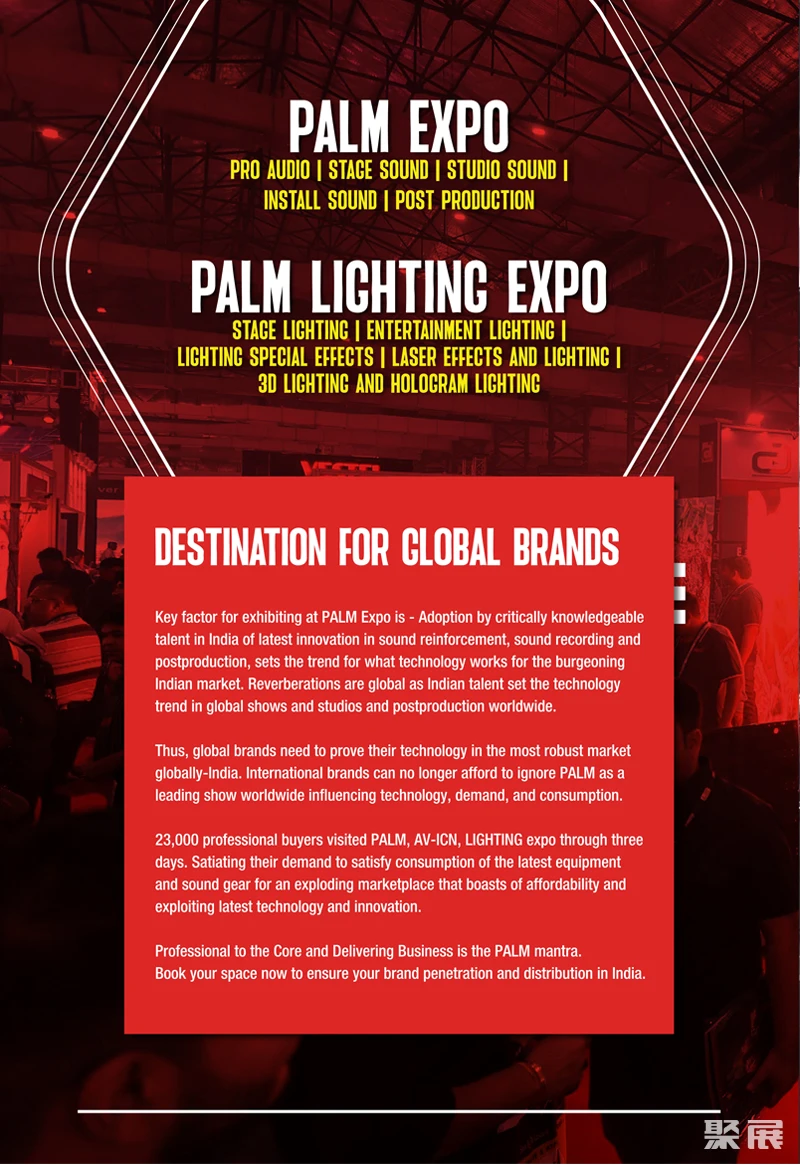 印度孟买专业灯光音响、系统集成及广播电视展览会(Palmexpo)这个节目提供了很好的可能性,可以聚在一起,发起有趣的商业关系。印度作为南亚次大陆最大的国家,旨在开发印度舞台灯光音响及乐器职业的企业来说是个不容错失的商机。(本文内容版权归属聚展所有,未经同意,禁止转发)