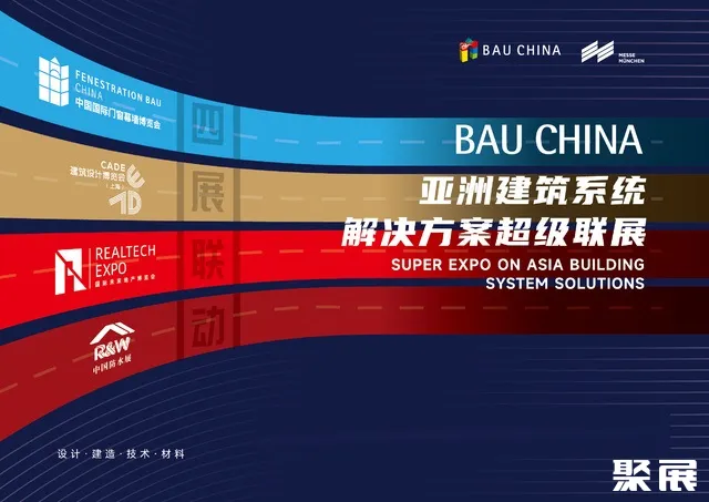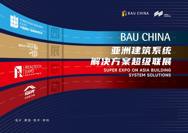 BAU CHINA集成四大建筑领域重磅展会——RealTech国际未来地产博览会、CADE建筑设计博览会、FBC中国国际门窗幕墙博览会、R&W中国防水。