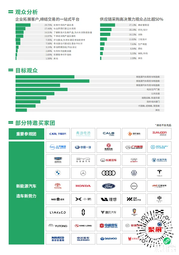 届时将集中展示新能源汽车整车、驱动电机、电控、动力电池、充换电技术装备、能源供给、电制动、电转向、电空调、内外饰设计制造、底盘系统、车身系统、行驶系统、芯片、智能网联自动驾驶、汽车电子、线束线缆、测试测量与质量监控、综合零部件、材料、加工设备、智能装备数字化工厂、配套设施等全产业链。竭力为产业上下游及垂直应用行业打造技术、贸易、品牌展示、学术交流为一体的专业平台,是海内外新能源汽车专业人士不容错过的盛会。